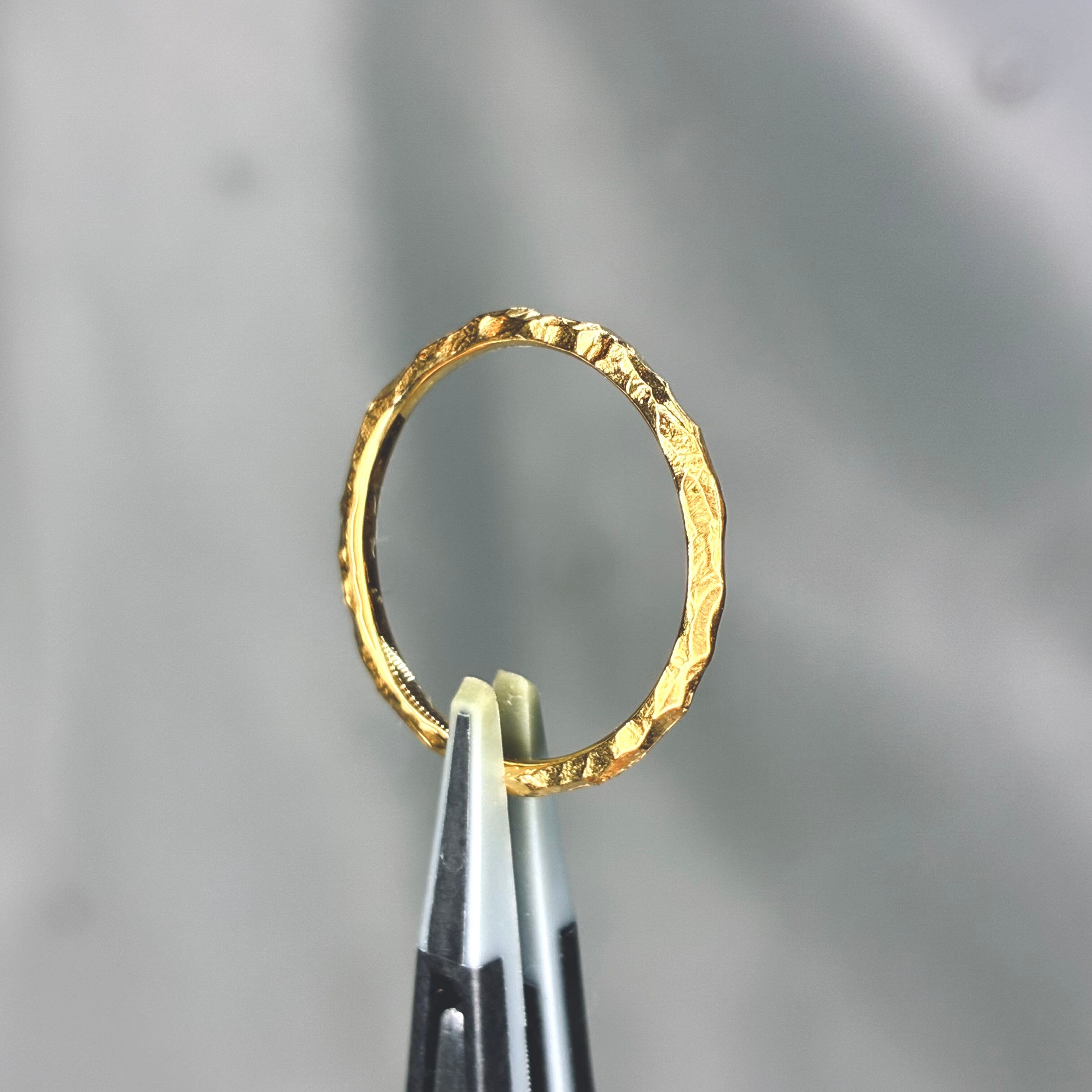 存在感抜群のK18 KIRAKIRAリングは槌目の加工が施され、光を受けてきらきらと輝きます。